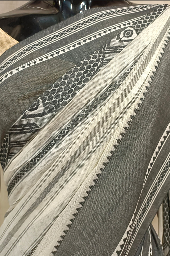 Off-White & Black Soft Handloom Traditional Dhonekali Cotton Saree With all Over Fish Motive Woven On Body