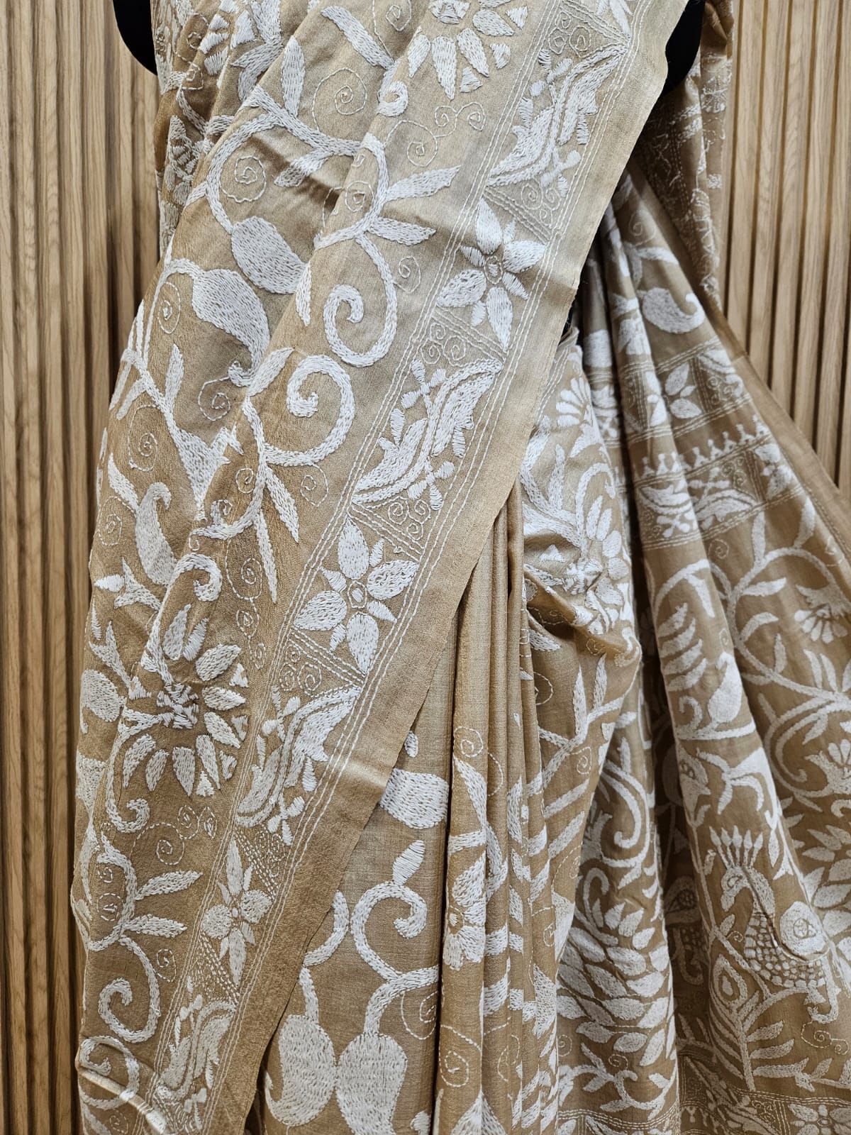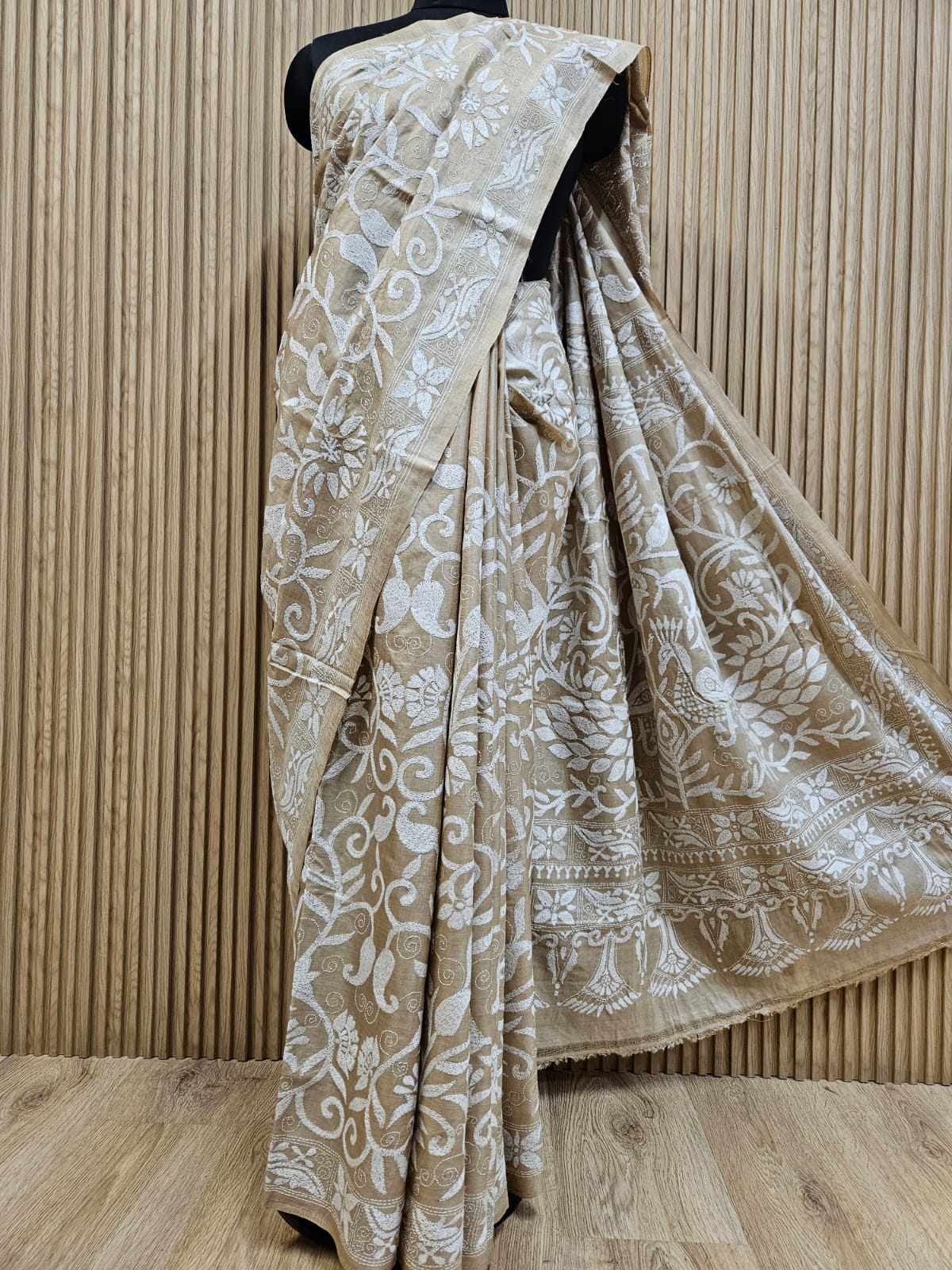 Cream & White Premium Gachhi Tussar Silk Kantha saree
