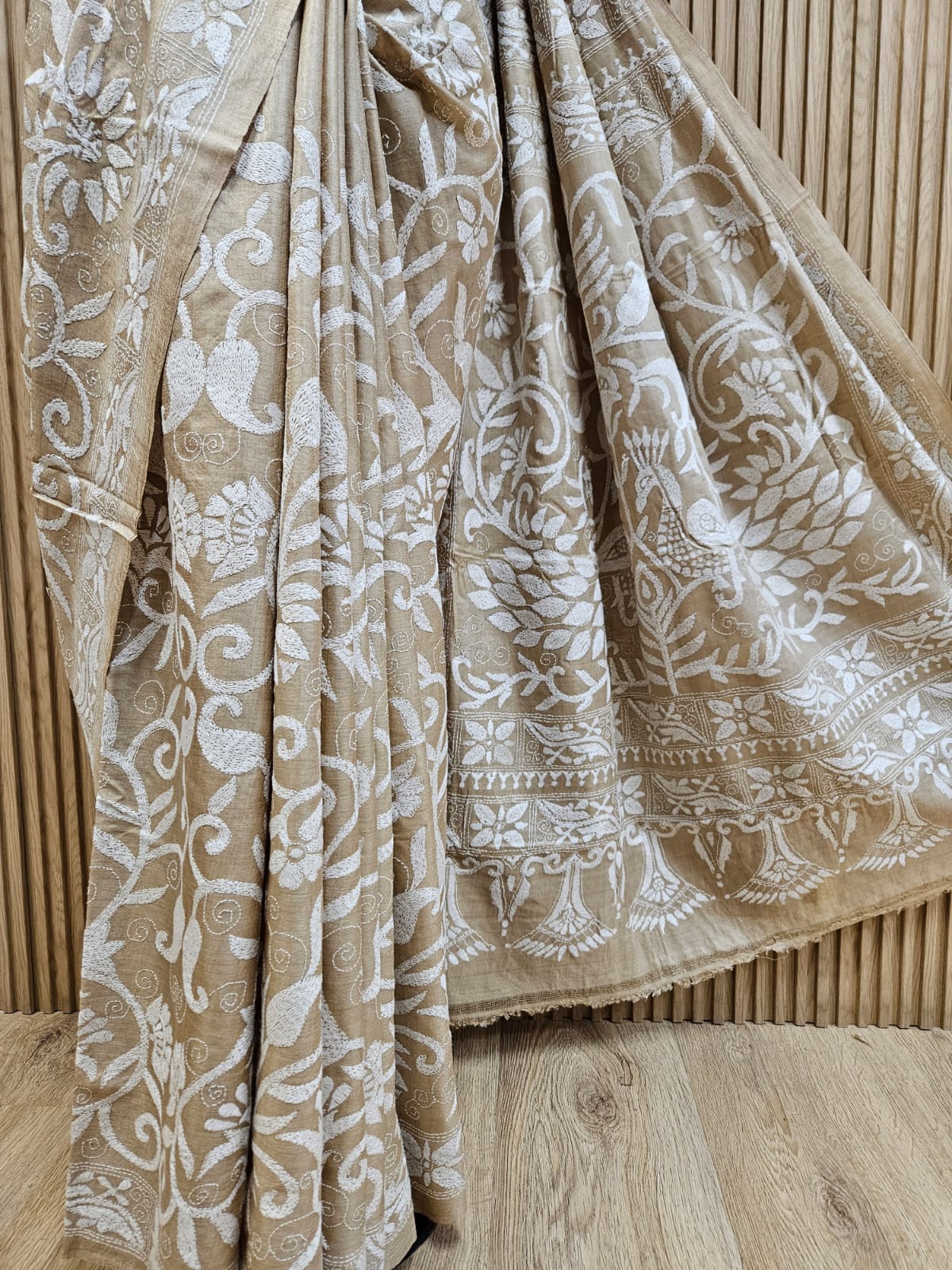 Handloom Premium Gachhi Tussar silk Handstitch kantha saree With Beige Color Bird and Floral Stich Border and Aanchal As an expert in the textile industry, I can say that this handstitched saree is a worthy addition to your wardrobe. Made with premium Gachhi Tussar silk, it boasts a beautiful beige color with a geometric stitch border and Aanchal. This saree is sure to add a touch of elegance and sophistication to your attire. Additionally, the handloom process ensures high quality and durability, making it a long-lasting investment.