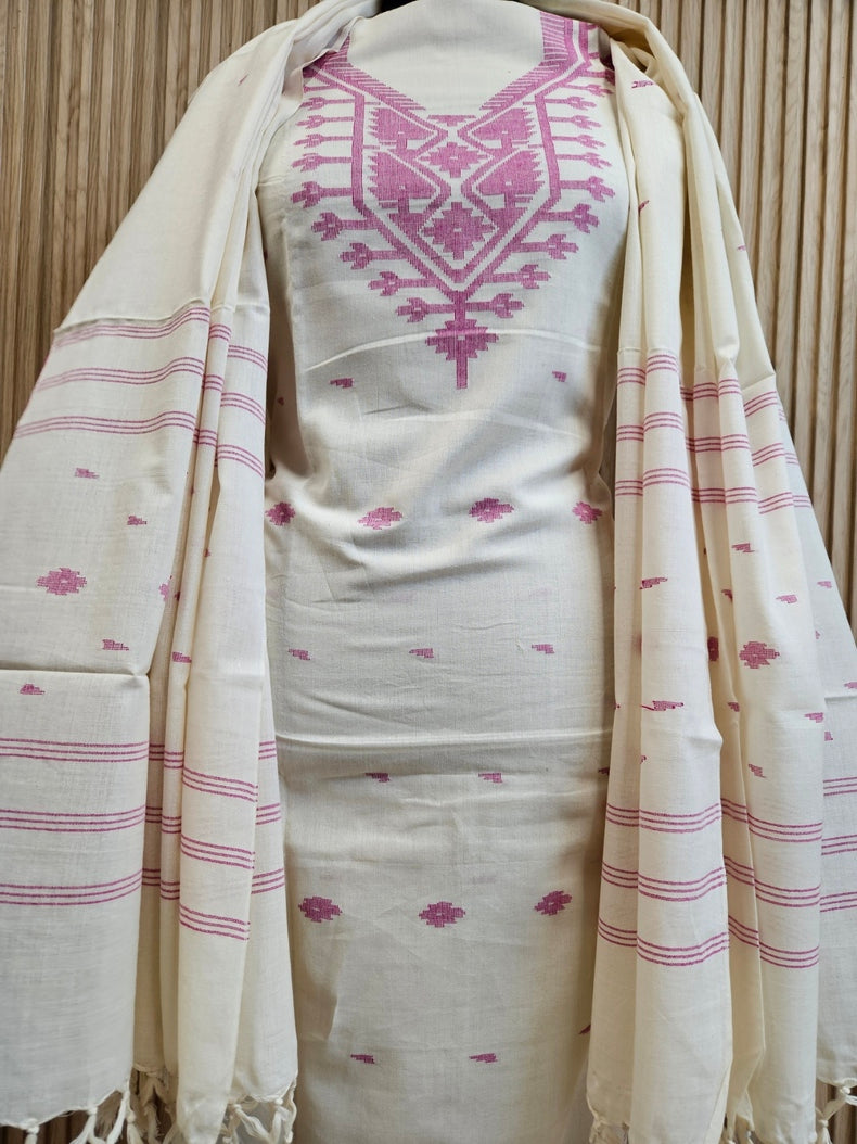 White & Purple Handwoven Cotton Jamdani 3-piece Kurta Set