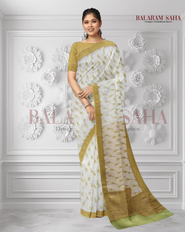 A Stunning Creation by Balaram Saha: White & Green Handloom Mulberry Printed Silk Saree